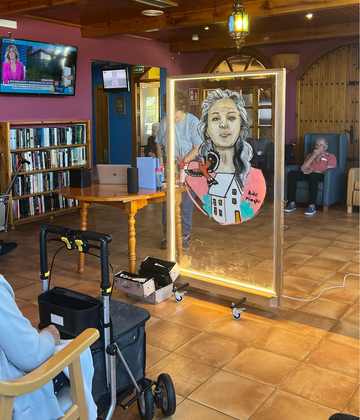 Junto a Marga del Monte, creamos el espectáculo La Abubilla en la residencia de mayores que lleva el mismo nombre. Mientras ella cantaba, yo pintaba en vivo una obra que personifica la esencia de la residencia: un reflejo de la fuerza, la sabiduría y el calor del hogar.